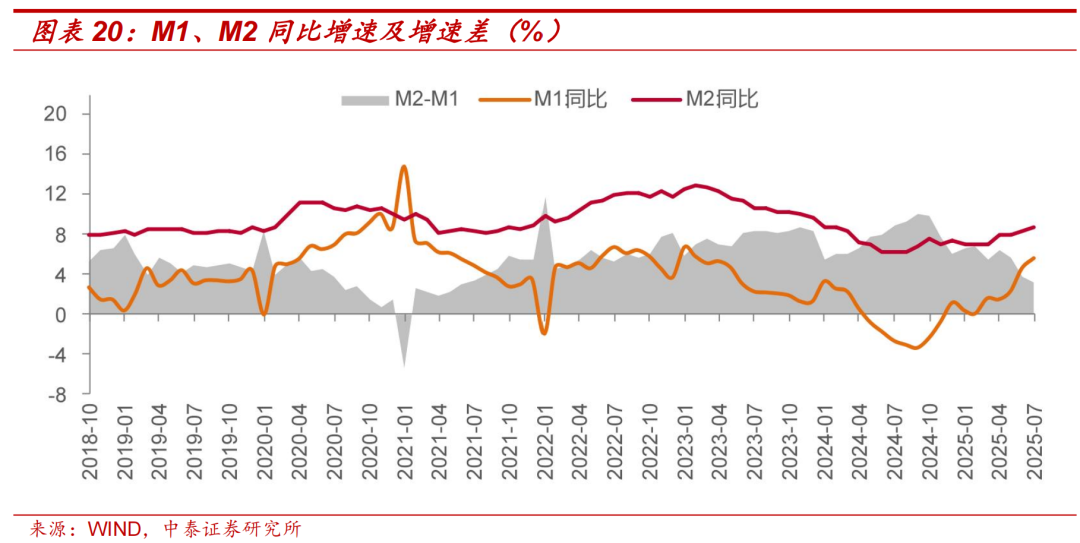 ◾存款活化支撑M1增速继续回升,去年低基数效应+权益市场情绪较高是主要原因。整个7月权益市场表现较好,截至7/31上证指数、沪深300较6月底涨幅达3.74%和3.54%,创业板指数更是上涨8.14%,带动存款活化,非银存款高增也能形成佐证。另一方面,政府债整体发行节奏较快也以企业活期存款形式对M1形成助力。
