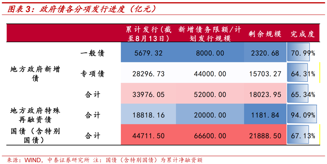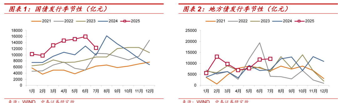 ◾社融增速持续修复,政府债核心支撑属于预期之内。社融增速进一步上行至9.0%,回升至去年2月水平。结构上政府债仍然是核心拉动项,7月整体政府债融资规模不低,尽管国债发行方面较前月明显回落,但仍在季节性偏高水平。截至目前(2025/8/13),国债净融资接近4.5万亿,年内发行进度达67%,地方政府一般债发行进度超7成,专项债发行在6成以上。政府部门偏强表现,对冲私人部门贷款偏弱表现,支撑社融增速向上修复。