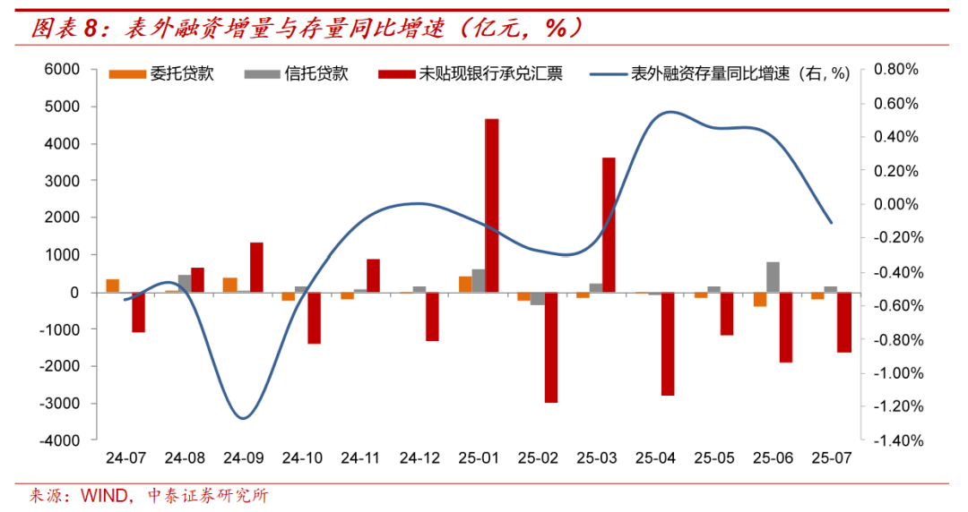 ◾表外融资存量增速转负。从表外融资来看,7月表外融资存量同比增速环比进一步回落0.51pct至-0.11%;具体来看,委托贷款减少177亿元,同比多减522亿元;信托贷款增加149亿元,同比多增175亿元;未贴现银行承兑汇票减少1639亿元,同比多减564亿元。