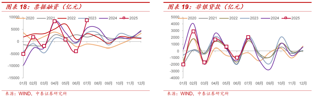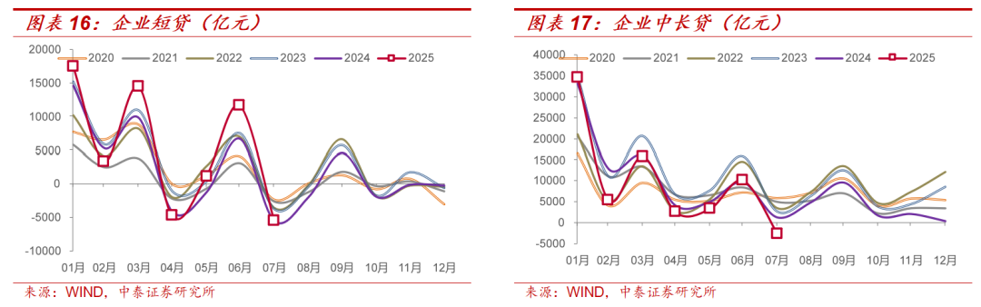 ◾2)企业中长贷年内首次负增,票据融资冲量显现。企业部门中分化显著,票据融资正增,而中长贷形成主要拖累,化债影响逐步减弱的同时企业融资意愿表现偏弱,放大季节性走低程度;短贷从6月的季节性高位回落,这也与7月末票据利率快速走低相对应,信贷不足,票据融资高增。