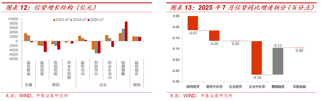 ◾7月新增人民币贷款-500亿元,同比多减3,100亿元,信贷余额同比增速较上月下降0.2pct至6.90%。各分项中,企业中长贷为主要拖累,负向拉动信贷同比增速0.16个百分点,居民短贷、中长贷均为负贡献,票据融资是主要支撑,正向拉动信贷增速0.12pct。