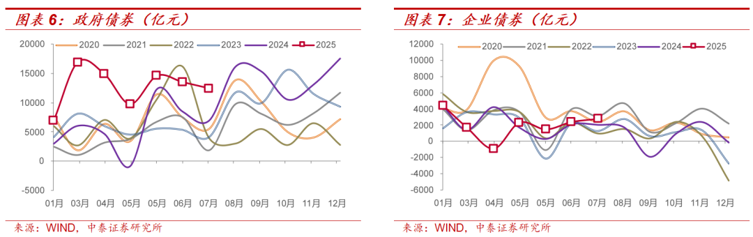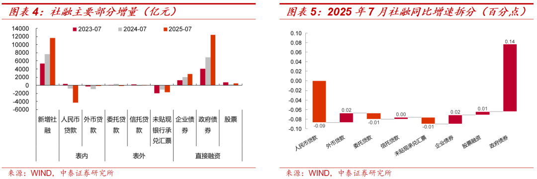 ◾政府债券对冲偏弱信贷,仍是社融核心拉动。从政府债来看,7月政府债券增加12,440亿元,同比多增5,559亿元,对社融规模同比增速形成主要贡献,拉动同比增速0.14个百分点。从企业债来看,7月企业债券增加2,791亿元,同比多增755亿元,拉动社融增速0.02pct。