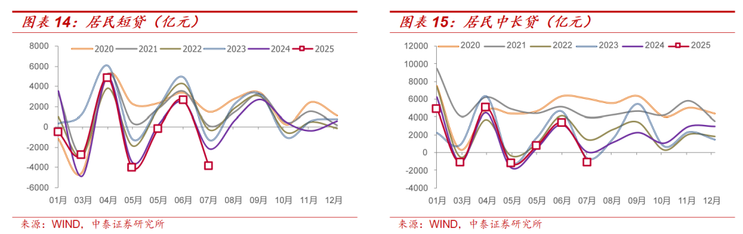 ◾居民部门中,短贷与中长贷均表现同比多减。从居民部门来看,7月居民贷款减少4,893亿元,同比多减2,793亿元;具体来看,居民短期贷款减少3,827亿元,同比多减1,671亿元;居民中长期贷款减少1,100亿元,同比多减1,200亿元。
